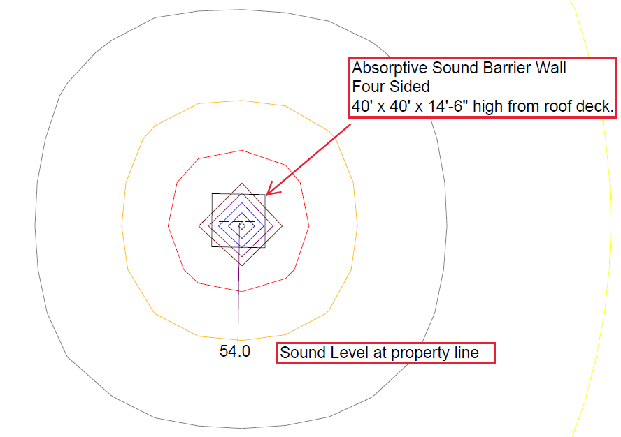 Below is an example of a hospital building, three stories high with two (2) existing air-cooled chillers on the roof mounted to a dunnage steel frame. They are currently within the city’s noise limit, but are planning to add a third chiller that may put them over the noise limit.